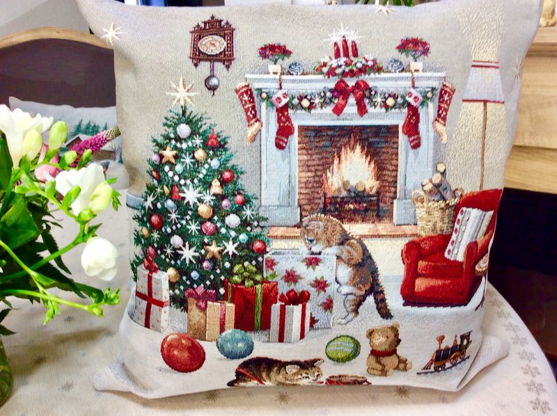 Autour d'un somptueux sapin éclairé et d'une cheminée crépitante, cette housse de coussin évoque l'intimité d'un salon prêt pour Noël. Un chaton espiègle, entouré de cadeaux colorés, ajoutent une touche de tendresse et de joie, impatients de découvrir les surprises que leur réservent les fêtes.