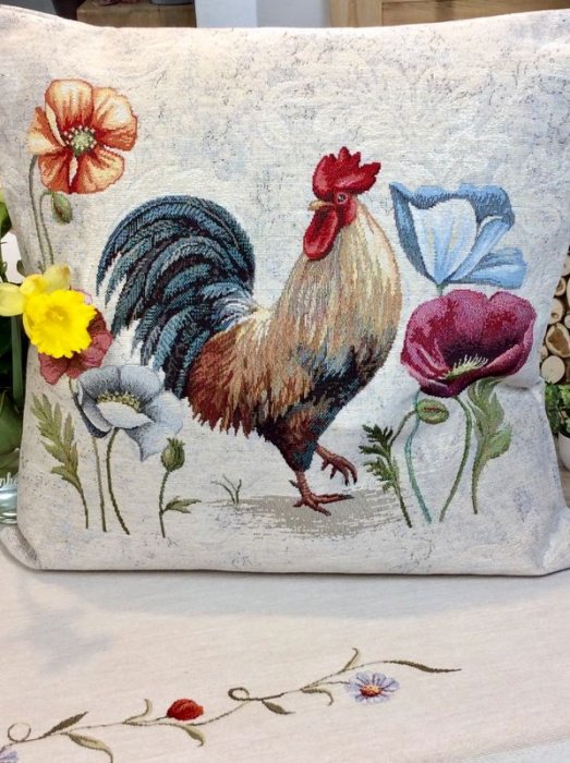 Très belle housse de coussin en polycoton jacquard. Son imprimé champêtre, représentant un magnifique coq, encadrés par de somptueux coquelicots, tissé des deux côtés parera merveilleusement vos fauteuils et canapé, et apportera une ambiance très agréable à votre intérieur. de détail