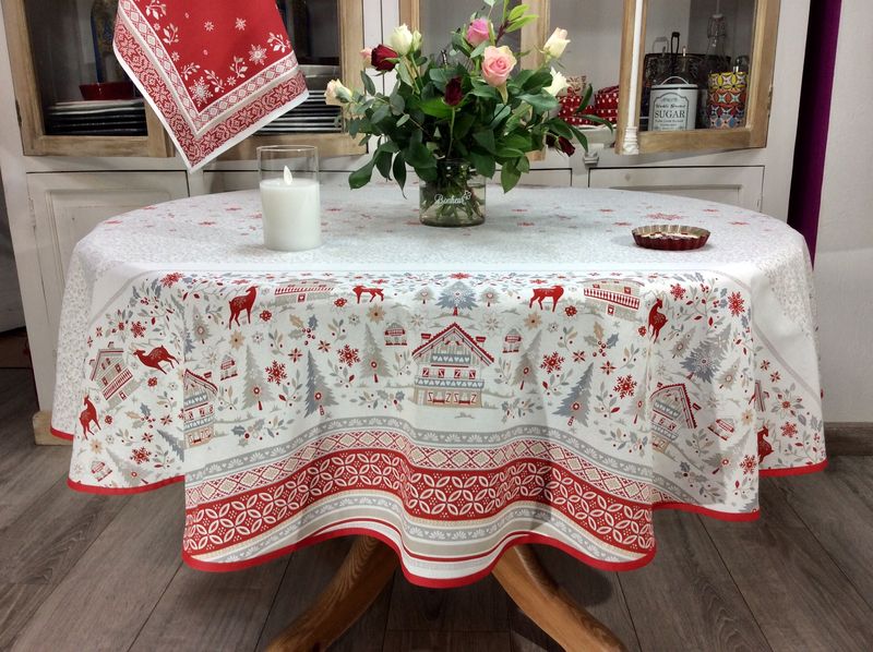 Belle nappe ronde, double bordure de Ø 160 cm, en coton, en deux coloris, dont le fond couleur perle fait ressortir superbement une scène hivernale, propice à la détente sous le feu doux de la cheminée ou sous la lumière magique de Noël. de détail