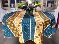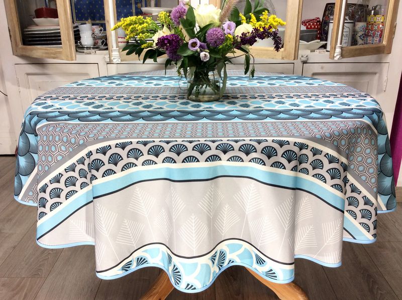 Nappe ronde en polyester anti-taches, de Ø160 cm, disponible en deux coloris tendance, turquoise-gris et bleu-jaune, arborant un imprimé linéaire d'éventails, d'hexagones et de branches stylisées. Cette nappe apportera une touche de modernité à votre table, en combinant style et praticité.
