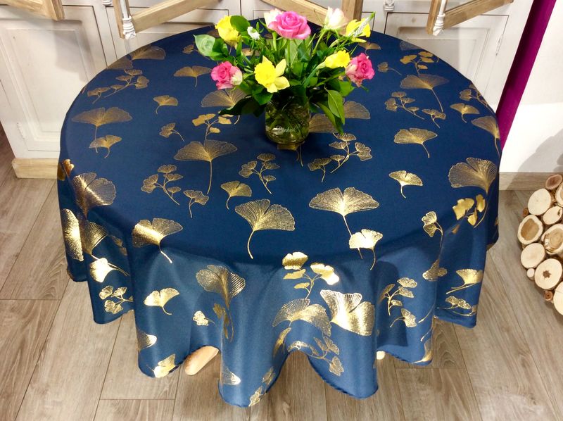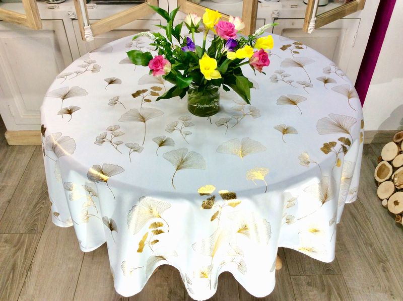 Elégante nappe, en polyester, qui apportera  un air de zénitude à votre décoration grâce à ses jolies feuilles de Gingko dorées, arbre d'Asie surtout connu pour sa longévité. Le fond blanc, vert ou bleu marine  s'adaptera aisément à votre intérieur et vous enchantera en toute occasion.