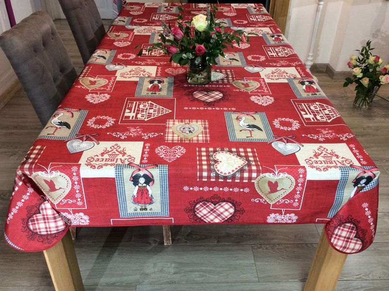 Cette nappe rectangulaire anti-taches, fond rouge ou gris, est une plongée au coeur de la tradition alsacienne. Ce beau tissu dévoile superbement quelques éléments typiques de l'Alsace, riche en symboles : belle alsacienne en costume traditonnel, cigognes, coeurs divers, maison alsacienne... de détail
