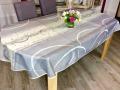Très belle nappe ovale, en polyester anti-taches, dont l'imprimé dévoile un graphisme résolument moderne où s'entrelacent, sur un fond gris-crème, des traits et des formes géométriques dans un chaos organisé. de détail