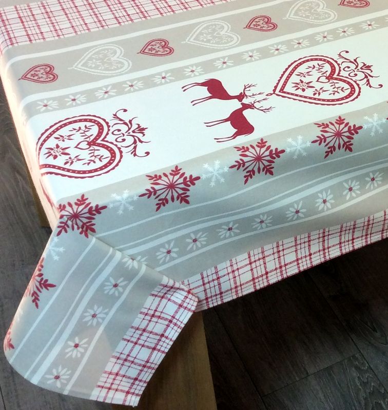Nappe Chamberry, rennes, coeurs, edelweiss, flocons, rouge, blanc, beige, fond écru,
