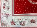 Tous les motifs hivernaux sont représentés dans cette magnifique nappe Montagne : neige et flocons, beaux bouquets d'edelweiss à chaque angle, sapins enneigés, chalets pittoresques, luges, skies, raquettes neige, etc