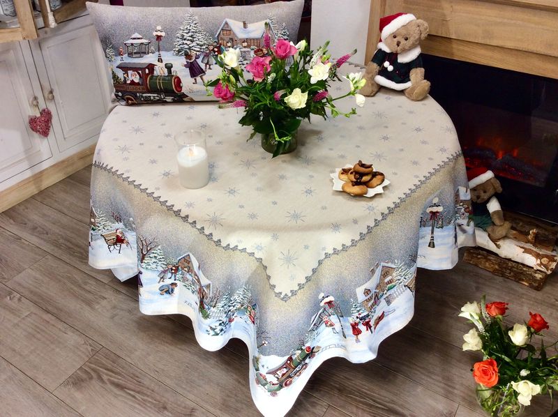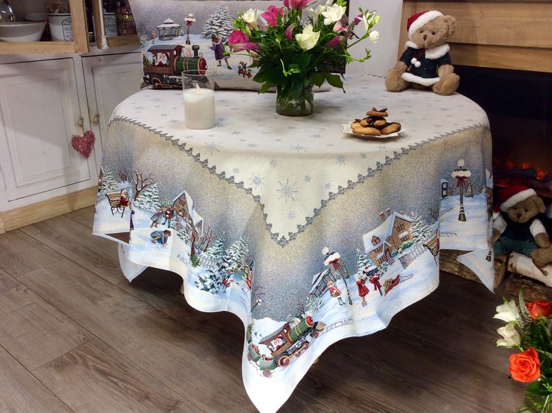 Prenez place autour de cette somptueuse nappe carrée de Noël, centrée, en polycoton jacquard qui vous fera le plaisir de vous emmener tout droit au Pays du Rêve. de détail