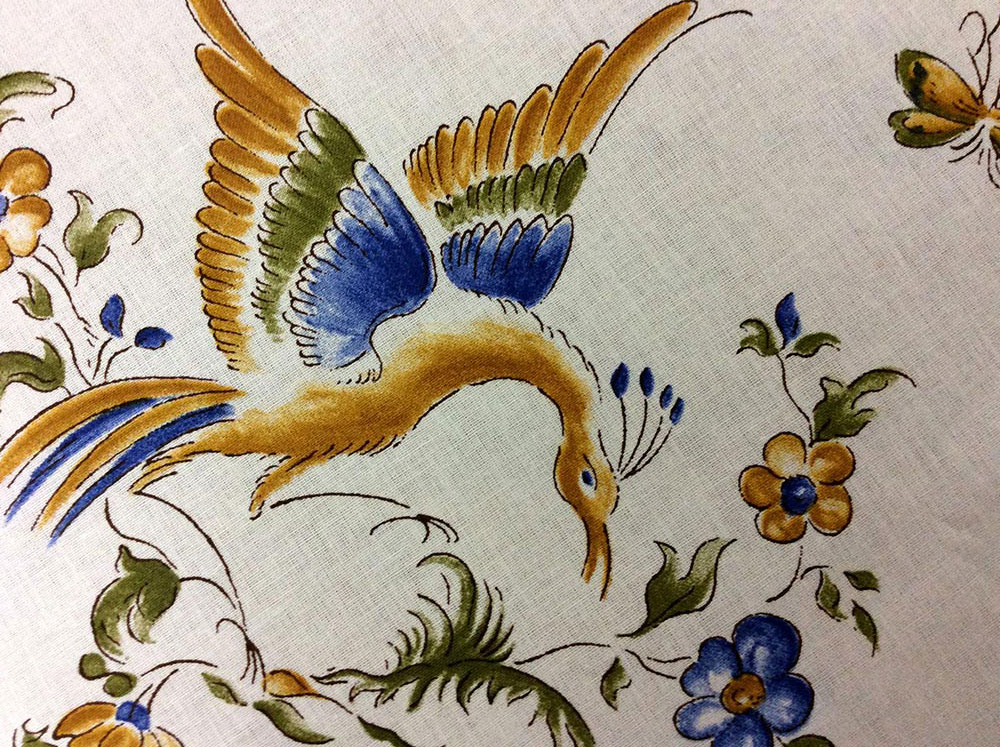 L’élégance de cette nappe n’est plus à démontrer. Oiseaux, papillons, bouquet de fleurs, branches vertes voltigent tout autour et sont circonscrits par des médaillons empreints d’un camaïeu bleu, vert et jaune.