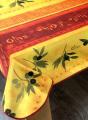 Nappe provençale, en polyester anti-taches, facile à vivre. L'imprimé linéaire richement orné d'olives, sur un fond orange-jaune ou bleu-jaune, épousera superbement votre table, rectangulaire ou ovale.