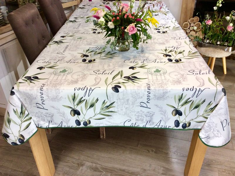 Belle nappe rectangulaire, en polyester anti-taches, dont les bouquets d'olives, sur un beau fond blanc ou jaune, vous plongera discrètement mais sûrement dans l'univers de la Provence de toujours.  de détail