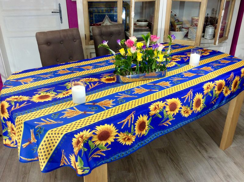 Voilà une belle nappe ovale, en polyester anti-taches, très représentative de la Provence, sur fond bleu ou rouge. Le tournesol, le blé et les olives symbolisent la nature chaleureuse du Sud. de détail