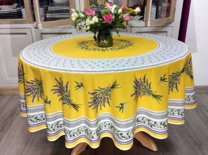 Très belle nappe provençale ronde centrée, ornée de bouquets de lavande et olives en deux coloris, écru ou jaune.