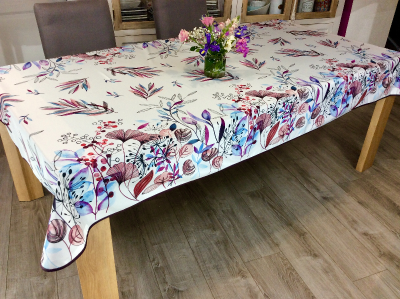 Autour des ginkgos s’épanouit un ensemble de feuillages et de fleurs stylisées, dessinés avec finesse et légèreté. Des touches de bleu céladon, de turquoise, de rose poudré ou de rouge délicat ponctuent la surface comme des éclats de couleur dans un jardin imaginaire. L’équilibre entre ces tonalités confère à la nappe une atmosphère naturelle et poétique, capable de s’adapter aussi bien à une décoration contemporaine qu’à une table plus classique.