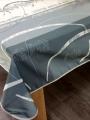 Très belle nappe rectangulaire, en polyester anti-taches, dont l'imprimé dévoile un graphisme résolument moderne où s'entrelacent, sur un fond gris-crème, des traits et des formes géométriques dans un chaos organisé. de détail