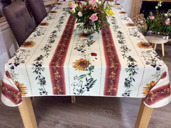 Nappe provençale, Tournesols olives, fond bordeaux-jaune,