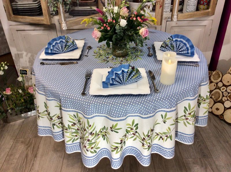 Nappe provençale ronde, centrée, en coton, imprimée au milieu d'une belle couronne d'olives et bordurée d'un superbe chapelet de bouquets d'olives. Voilà une véritable plongée dans la Provence traditionnelle. de détail