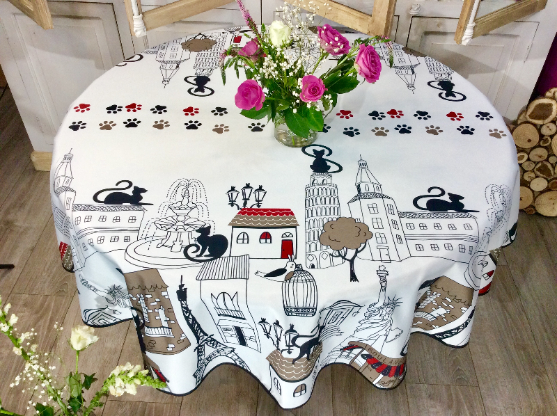 La palette chromatique repose sur un contraste élégant entre le fond clair et les touches de noir, de rouge et de beige. Les chats noirs, silhouettes souples et mystérieuses, ponctuent la composition avec légèreté, tandis que les détails colorés (toitures rouges, enseignes discrètes, éléments architecturaux) apportent chaleur et relief. Cet équilibre visuel crée une nappe facile à associer, idéale pour sublimer une table moderne ou apporter une note artistique à un intérieur classique.