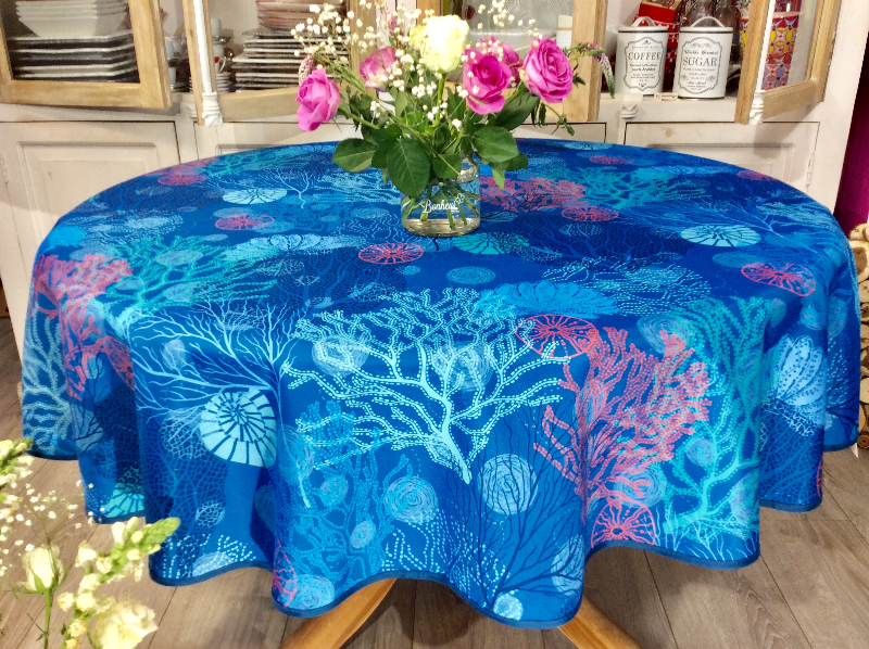 La palette chromatique repose sur une dominance de bleus intenses, allant du bleu profond au turquoise lumineux. Ces nuances évoquent les variations de la mer, du large aux eaux peu profondes. Les touches de rose corail, de bleu clair et de motifs plus lumineux viennent ponctuer l’ensemble, créant un contraste subtil et raffiné. Cette harmonie de couleurs confère à la nappe une atmosphère à la fois apaisante et dynamique, parfaite pour illuminer un intérieur.