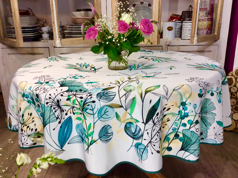 Autour des ginkgos s’épanouit un ensemble de feuillages et de fleurs stylisées, dessinés avec finesse et légèreté. Des touches de bleu céladon, de turquoise, de rose poudré ou de rouge délicat ponctuent la surface comme des éclats de couleur dans un jardin imaginaire. L’équilibre entre ces tonalités confère à la nappe une atmosphère naturelle et poétique, capable de s’adapter aussi bien à une décoration contemporaine qu’à une table plus classique.